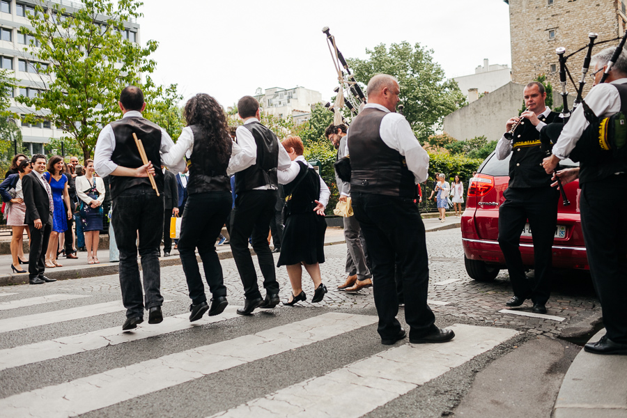Sur cette photo, par exemple, les mariés avaient choisi d’engager un bagad pour marquer leur sortie de la mairie. Une manière originale de remplacer le lancé de riz ou de pétales, de plus en plus interdit par ailleurs, à mon grand désespoir. Les cornemuses et les bombardes ont ensuite accueillis les invités devant le restaurant. Et quelques pas de danse traditionnelle ont été exécutés.