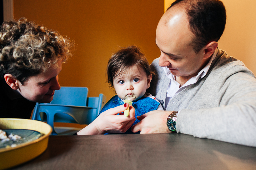 Séance photo famille chez Achille 8 mois, en train de déjeuner, avec l'aide de ses parents , photo prise par Flo Moncenis Photography
